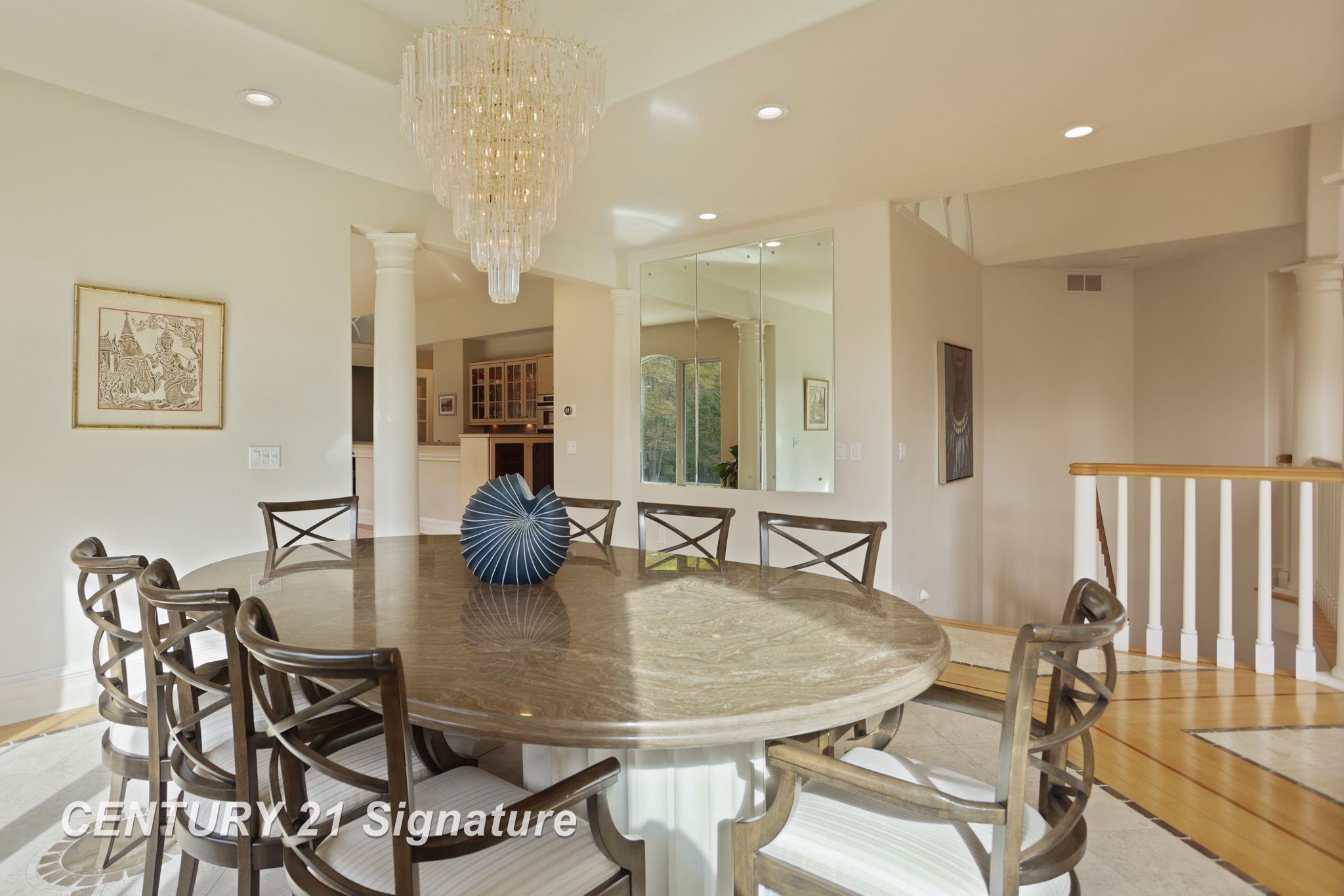 Discover this meticulously maintained 5 bedroom, 4 ½ bath custom-built home offering almost 6,000 sq. ft. of refined living space in the prestigious Sawmill Golf Club community. A grand foyer with skylights welcomes you into an open, light-filled floor plan featuring vaulted ceilings, crown molding, a fireplace and walls of windows overlooking the beautifully landscaped backyard. The gourmet kitchen with a butler’s pantry and breakfast nook opens to a family room and deck, ideal for entertaining. The main level includes two private suites, including a luxurious primary retreat with a spa-like bath and expansive walk-in closet, plus a guest suite with private bath. A professional office, half bath, and laundry room complete the main floor. The finished walkout lower level features a recreation room with full kitchen, three additional bedrooms, two baths, second office space with fireplace, sitting area, exercise room, tool room, and ample storage, with access to a private patio and three-car garage. Recent updates include a new furnace, AC, water heater, patio, gutters, garage doors, audio system, drainage system, roof 2018, and landscaping. This exceptional home combines elegance, quality, and comfort—perfect for luxurious everyday living or effortless entertaining.