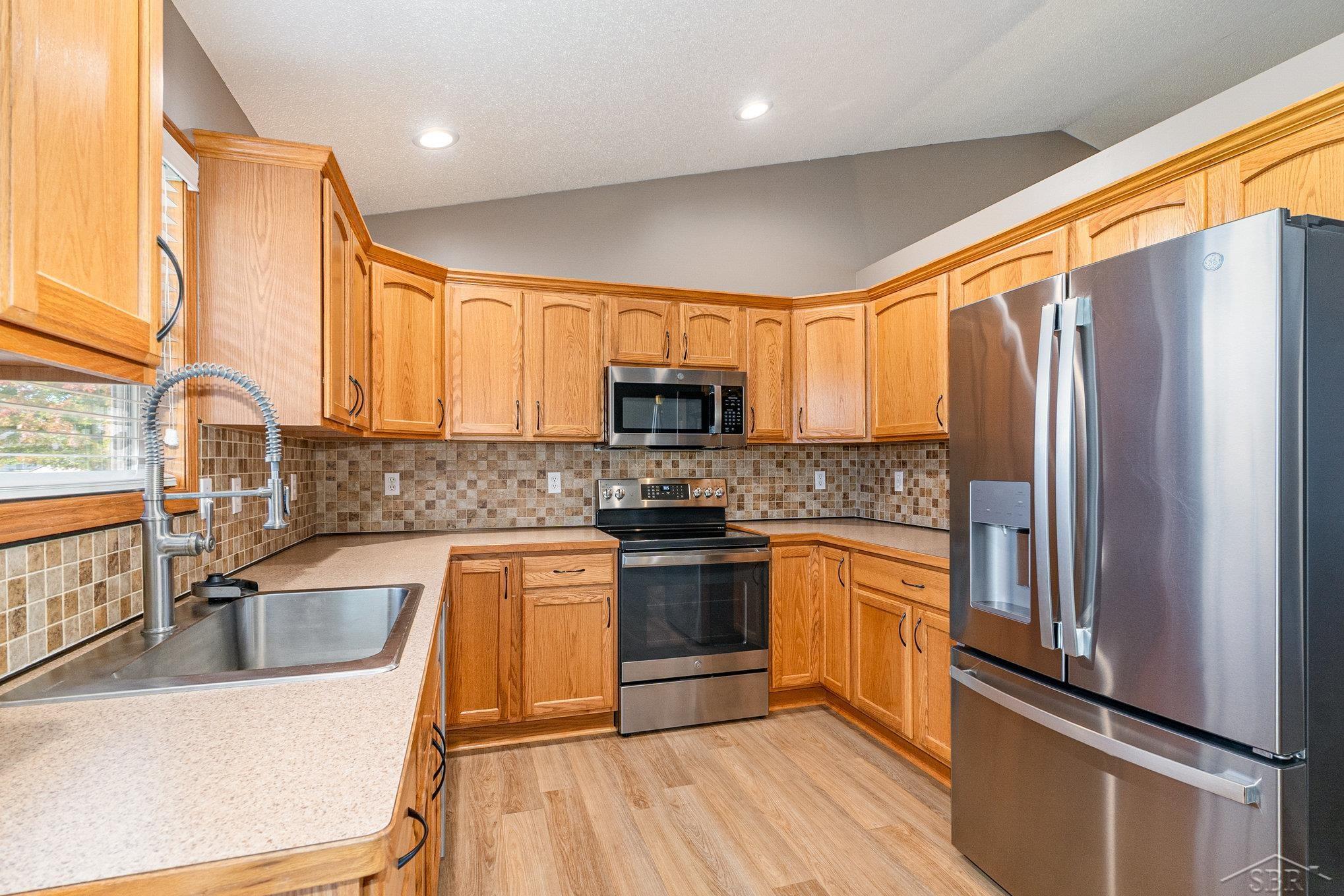Welcome home to this well-maintained 3-bedroom, 2-bath ranch that blends comfort and convenience in a single-level layout. Vaulted ceilings and an open floor plan invite natural light throughout the living space. A spacious family room connects seamlessly to the dining area and kitchen, where new carpet and luxury vinyl plank flooring add a fresh touch. Oak cabinetry, ceramic tile backsplash, and updated appliances make the kitchen both functional and charming. Designed with privacy in mind, the split-bedroom layout includes a generous primary suite with his-and-her closets and an ensuite bath featuring a walk-in shower. Both bathrooms have been thoughtfully updated with new vanities and flooring. Downstairs, the finished basement offers a spacious versatile space -- perfect for movie nights, game days, or entertaining at the built-in bar. This standout space nearly doubles your living area! Step outside to enjoy a fully fenced backyard complete with a shed, stone firepit, patio, and pergola—ideal for relaxing or hosting gatherings. This gem won’t last long, text your favorite Realtor today!